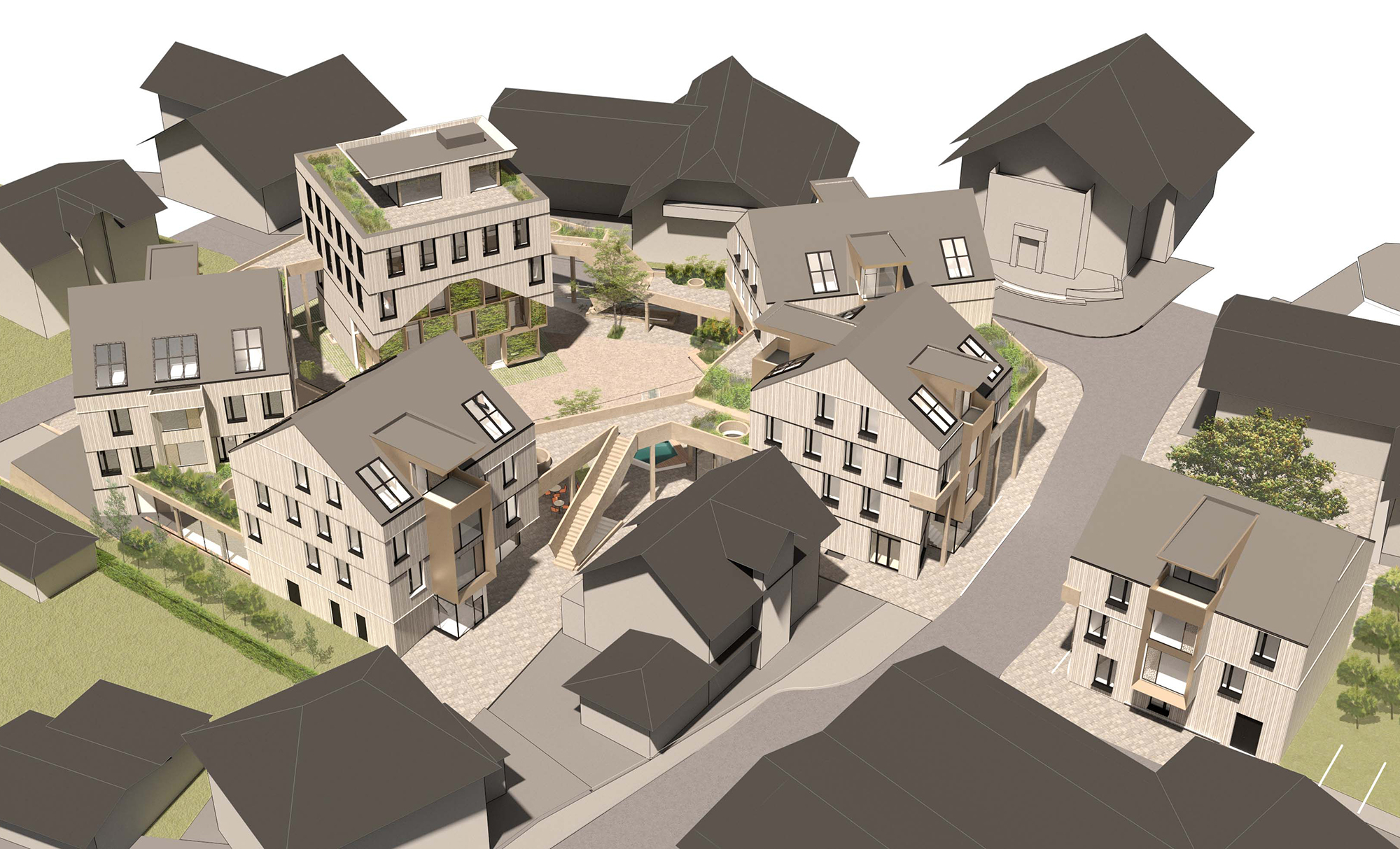 Um genau solche Zwischenbereiche zwischen privat, halböffentlich und öffentlich geht es in diesem Bebauungskonzept. Das Konzept versucht eine Verbindung zwischen diesen Bereichen herzustellen. Die Platzgestaltung konzentriert sich auf einen Bereich in Grödig, der sich in einer sehr zentralen Lage befindet, und dadurch eine Vielzahl von Ein-, Aus- und Durchblicken in die Marktgemeinde zulässt. Der Hauptzugang zum Platz wird durch ein großes städtebauliches Tor erschlossen. Dieses Tor rahmt den Blick von der Hauptstraße auf das Innere des Platzes und lässt die dortigen Aktivitäten erkennen. Die aufgelockerte Stellung der Gebäude und die Einbindung in das angrenzende Stadtgefüge machen eine natürliche und harmonische Einfügung in die Marktgemeinde möglich. Im Folgenden umringt ein vorgelagerter Arkadengang (Säulengang) mit unterschiedlichen Höhen verschiedene Aufenthaltszonen rund um das Zentrum des Platzes. Der Arkadengang bildet ein umlaufendes Band, das die angrenzenden Gebäude als städtebauliche Kernhäuser miteinander verbindet. Als Kulisse für den zentralen Bereich des Marktplatzes soll die historische Fassade des Bauernhofes dienen. Sie wirkt somit als Vermittler zwischen traditioneller und zeitgenössischer Baukultur.